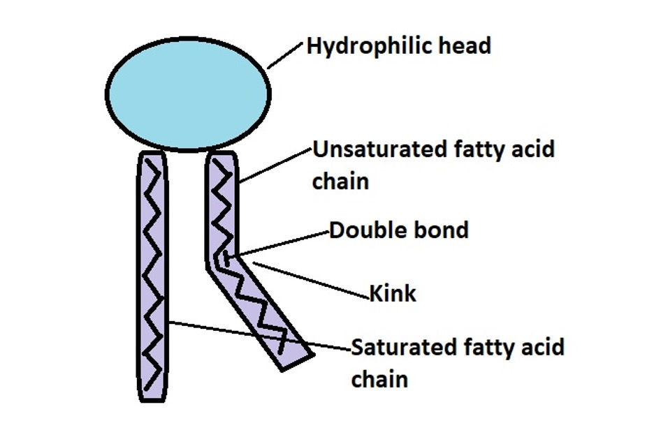 Phospholipids can have slightly different tails. Their tails are made from fatty acids, but not always the same. A straight tail is made of saturated fatty acids and a tail with a kink in it (caused by a C=C double bond) is an unsaturated fatty acid.