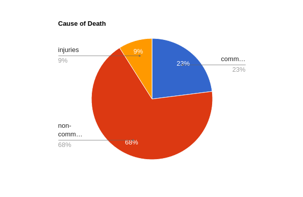 We know that 23% is 13 million, so we can extrapolate from that to discover what 1% is and then multiply that by 69 to find out what 69% is. From here, we learn that 39 million people die of non communicable diseases. The number is only approximate because records are not entirely accurate, and some countries do not publish data at all.